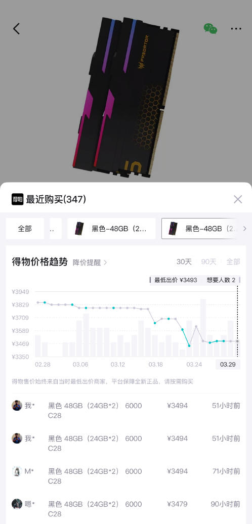 得物App最新数据显示,以宏碁掠夺者DDR5(48GB)内存条为例,其市场成交价已从2026年以来的峰值4019元一路下滑至当前的3494元,累计下跌525元,跌幅约13%。更为引人注目的是,在3月20日和21日,该产品甚至连续两天出现单日跌幅超100元的罕见情形,市场恐慌情绪可见一斑。